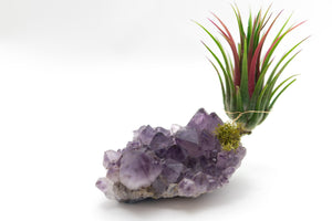 Air Plant and mineral terrarium are stunning with Amethyst crystal and air plant. Beautiful Amethyst with a lovely Tillandsia (air plant, yes it's real and yes it needs water, just no soil) attached with our custom designed air plant holster.