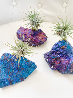 Chalcopyrite or Peackock Ore with a lovely air plant or Tillandsia attached. Healing crystal with air plant is a lovely gift. Air plant is attached with our custom designed air plant holster. Beautiful natural colors caused by oxidation.